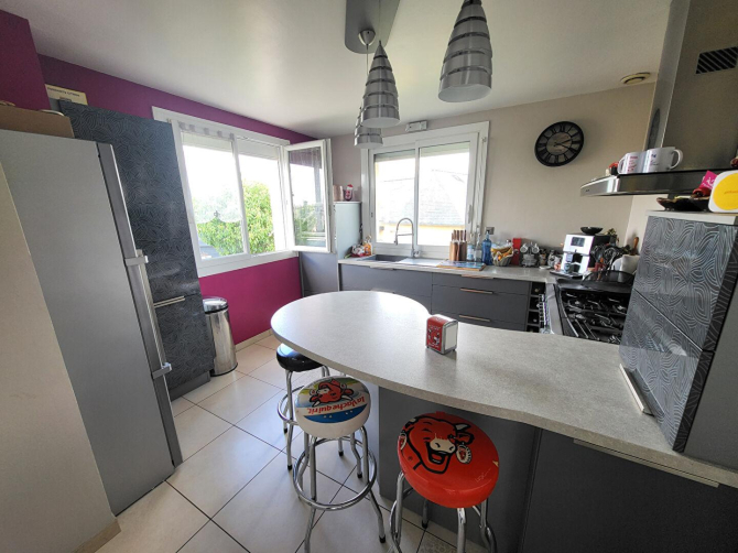 D'une surface de 142 m² de surface plancher, lumineuse et fonctionnelle, elle offre un agréable espace de vie totalisant près de 46m² avec un salon/séjour avec poêle à bois puis une cuisine aménagée et équipée.