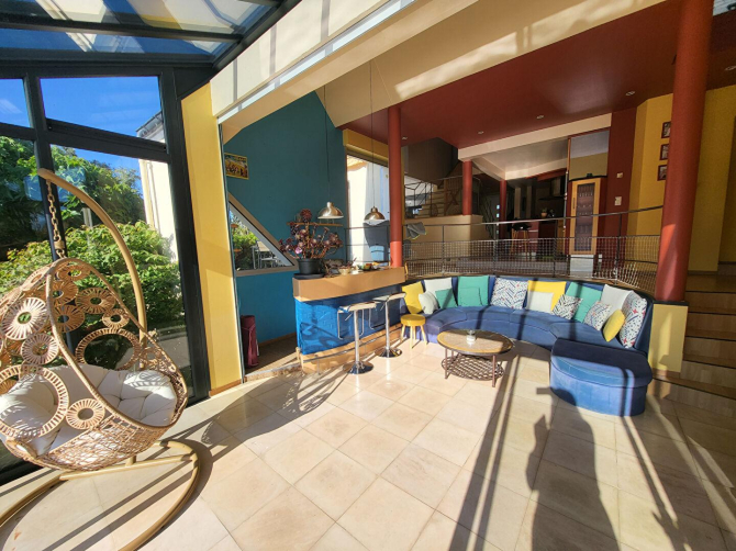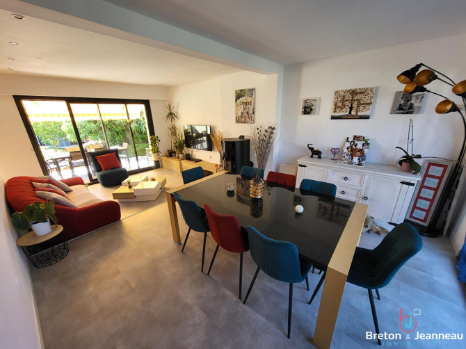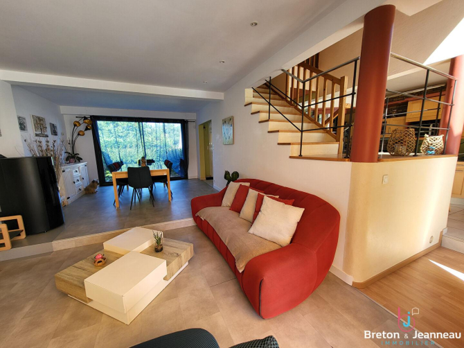 L'intérieur propose de généreux volumes : près de 100 m² d'espaces de vie lumineux et conviviaux, complétés par quatre chambres, permettant d'y vivre avec confort et fluidité.